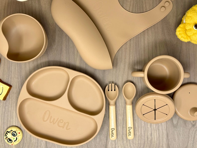 Personalized Silicone Baby Weaning Set | Engraved Silicone Bib | Custom Weaning Set for Toddler | Baby Feeding Set | Baby Shower Gift