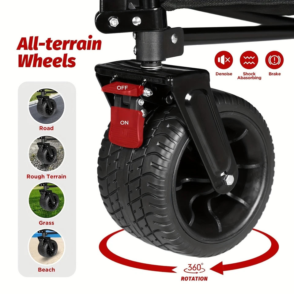 - Two Brakes & Built-in Dual Bearings: Featuring silent, 360° rotating front wheels; Dual-bearing design The double bearing design makes smooth rolling on mud, grass, and sand; two brakes allow the wagon to stop smoothly on slopes
