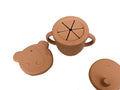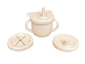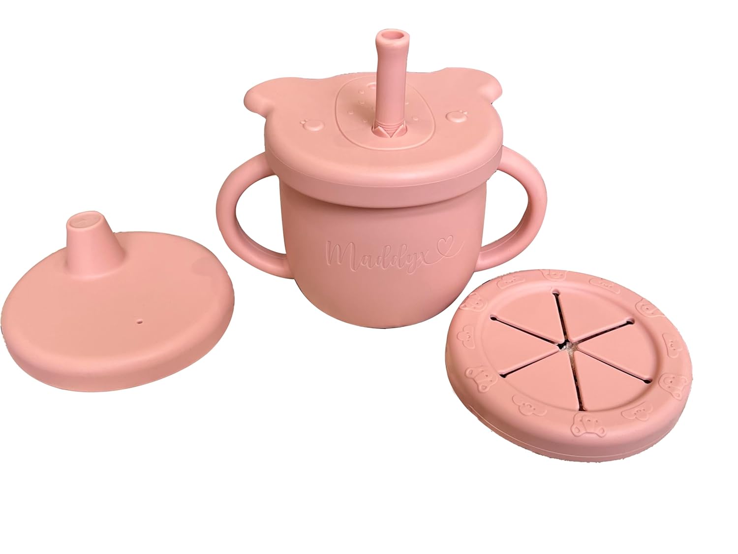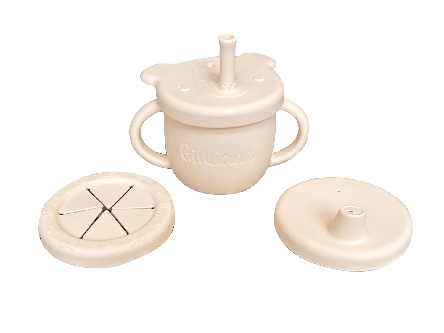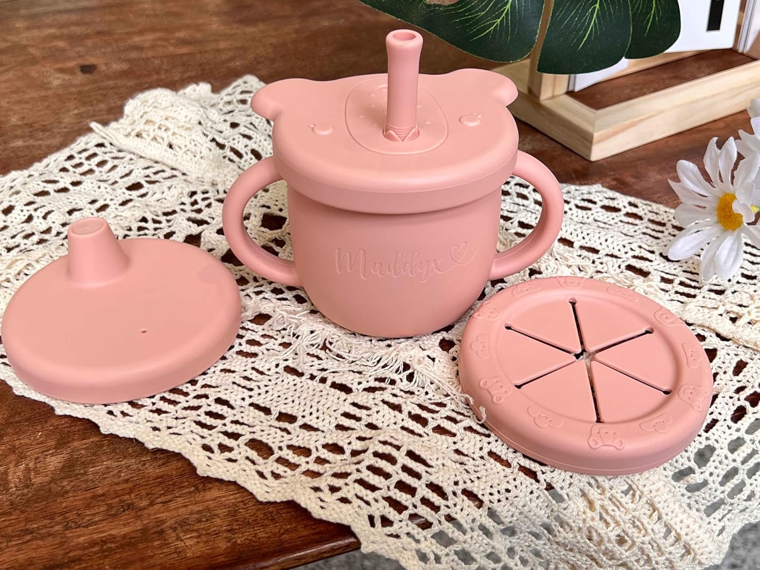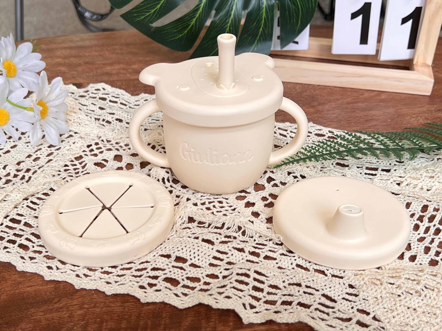 Custom Name Silicone Baby Snack Cup with Handle,Personalized Spill Proof Food Container for Toddler Baby ,Training Cup with 3 Lids,Newborn Gift,Gift for Baby Shower Gift,9oz (Beige)