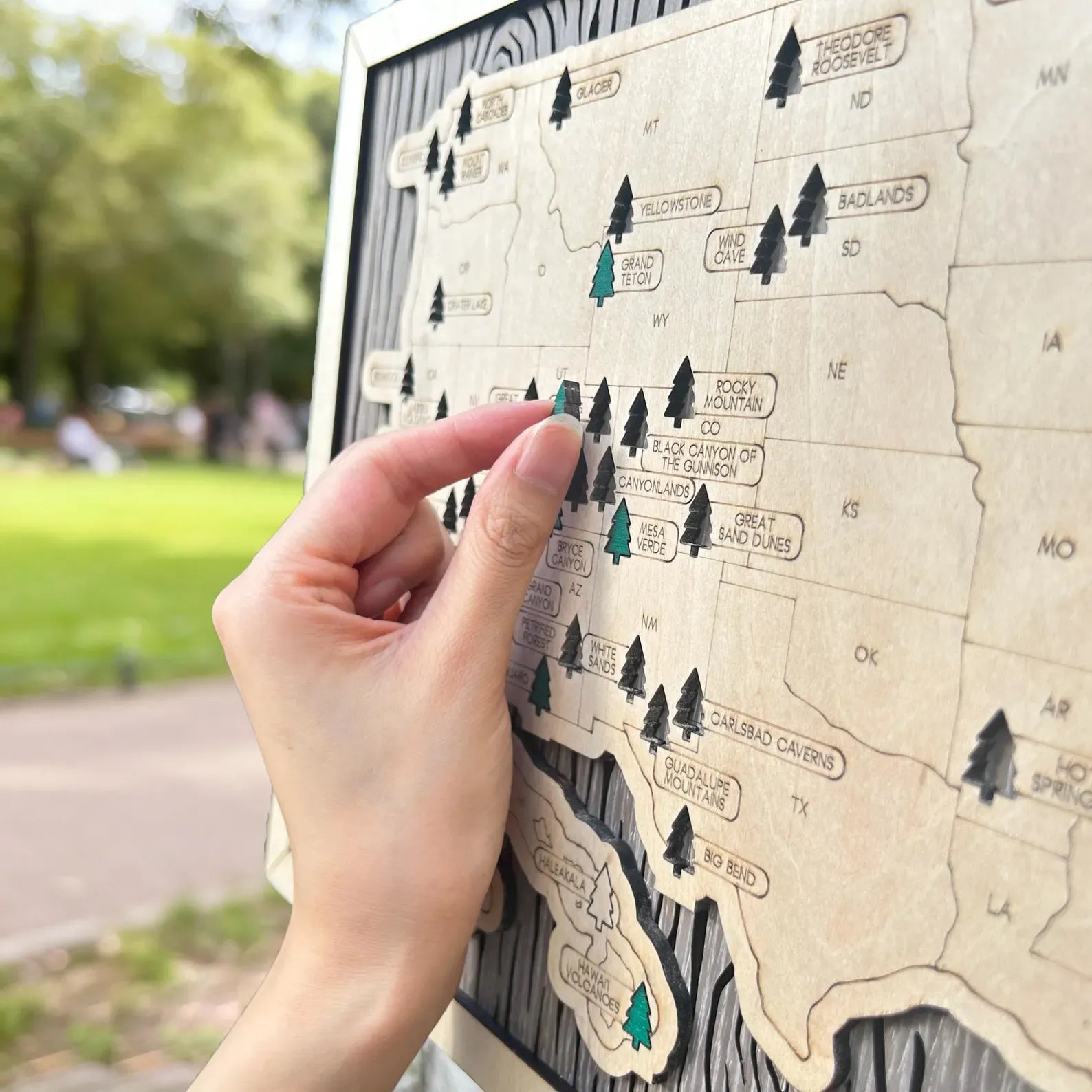 Capture every national park milestone with this exquisite wooden map—a stunning visual record of your outdoor adventures. Simply place the included green tree markers on parks you've conquered, creating a personalized travel narrative right on your wall.