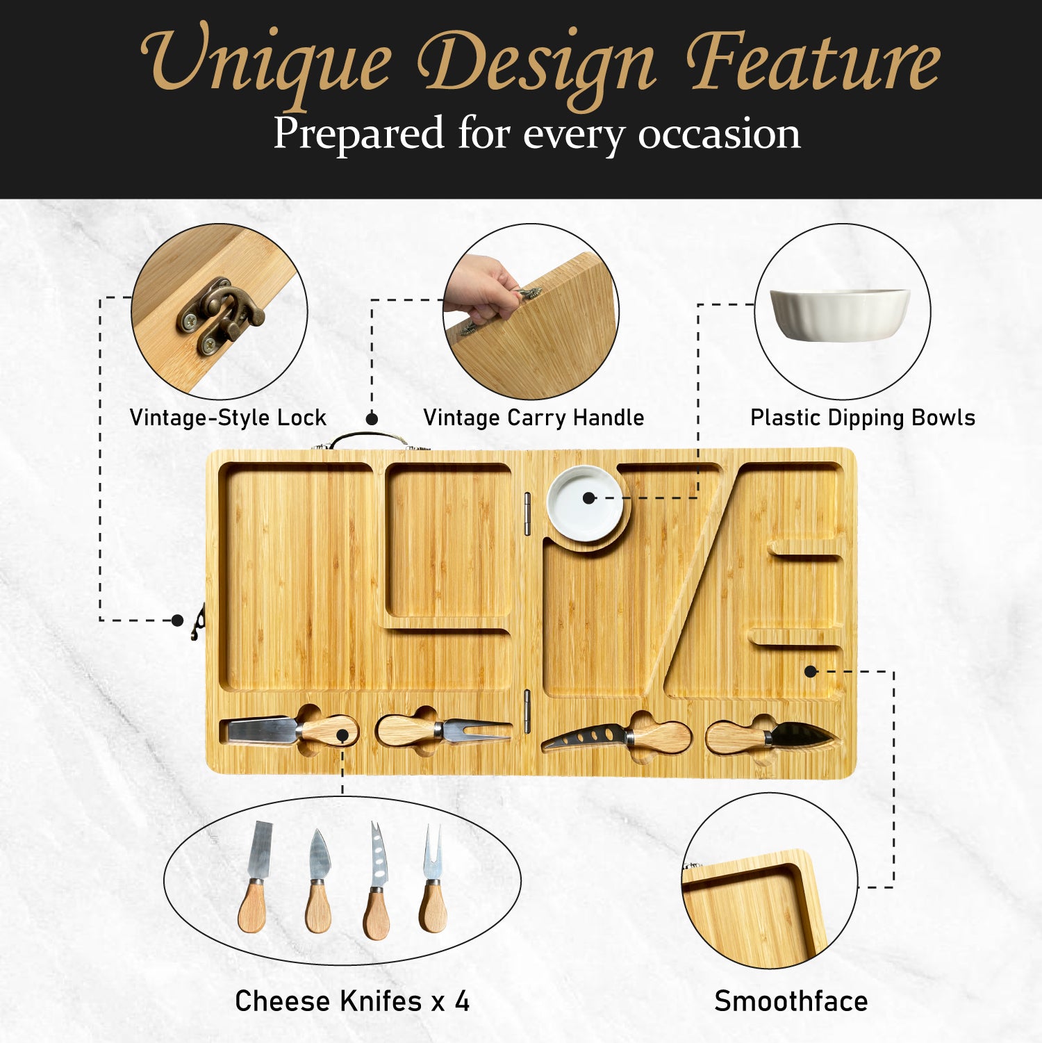 A large, versatile serving board for cheeses, meats, fruits, crackers, and more—ideal for weddings, housewarmings, picnics, and dinner parties. Impress guests with an elegant, well-arranged spread.