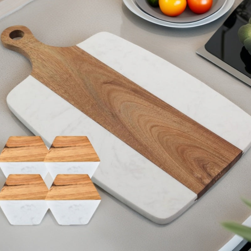 Elevate your kitchen experience with this elegant Acacia Wood & White Marble Splicing Cutting Board, complete with 4 matching coasters. Designed for both functionality and style, this set is perfect for food prep, serving, and entertaining.