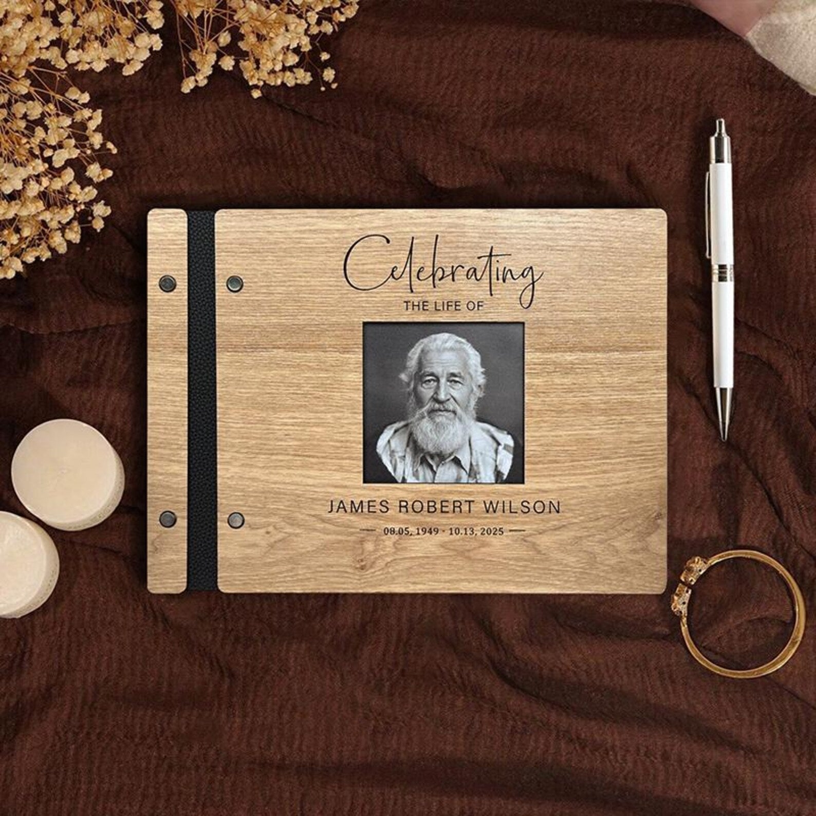 Celebrate and honor a life well‑lived with this custom wooden memorial guest book, featuring a cover photo frame to display your loved one’s picture and the text “Celebrating the life of,” creating a timeless keepsake filled with memories and words of comfort.