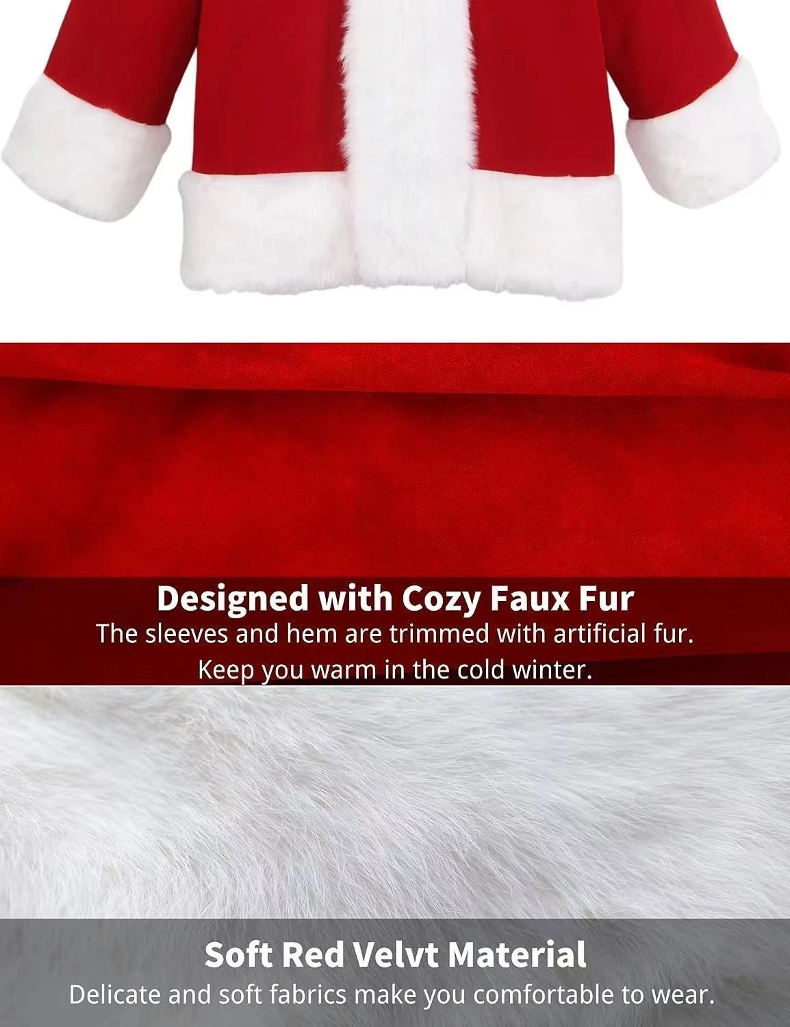 - SANTA SUIT ADULTS MEN HIGH-QUALITY MATERIALS---The deluxe Santa Claus Costume for Men is made of 100% polyester and wine red plush material. The jacket, pants, hat and boots of velvet adult Santa Costume are trimmed with white luxurious long plush faux fur. This Santa suit adults men is comfortable, soft and warm for wear. which can keep you warm and cozy in cold winter.