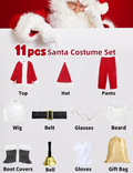 Package Included: (11Pcs) 1 x Santa Coat 1 x Santa Pants 1 x Santa Hat 1 x Black Belt with Buckle 1 x Boots Cover 1 x White Gloves 1 x Santa Wig 1 x Santa Beard 1 x Gold Gift Bag 1 x Glasses 1 x Bell 2 x Whistles Contacts and Notes - Products due to the angle of view or light problems will produce a slight visual difference, which is normal range. - If you are interested in the product at any time to find us to ask about matters, we will be happy to serve!