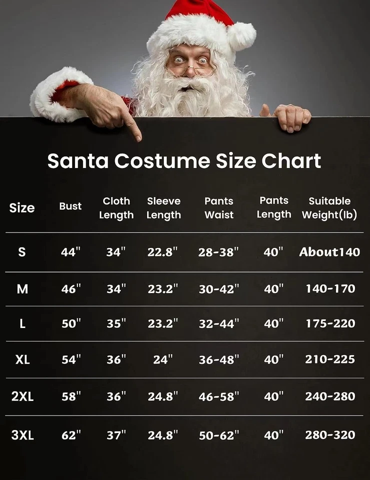 - SANTA CLAUS COSTUME FOR MEN FIVE SIZE FIT ALL MEN---12Pcs Santa Suit for men Large size suitable for men under 150lbs; X-large size great for men under 200lbs; XX-Large size right for strong men under 250lbs; Updated the plus size of 3XL-Large for people under 300lbs. Please refer to our size chart picture for specific size information, made sure to select right size for Santa suit.