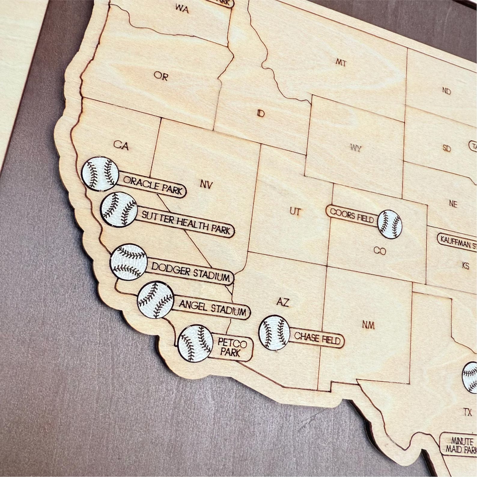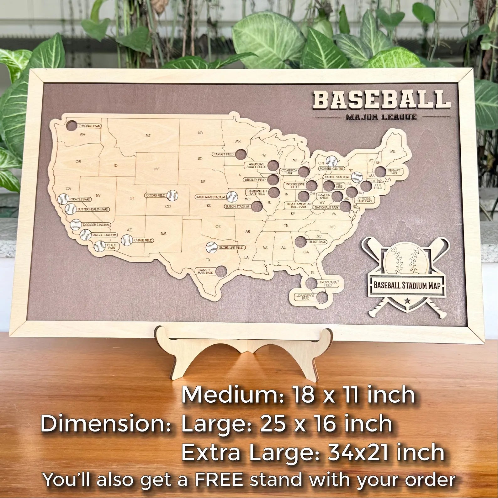 Crafted from premium wood, this detailed map marks every Major League Baseball stadium across the country. It allows you to proudly track your journey and showcase your progress as you visit iconic venues. Available in three sizes, it fits seamlessly into your living home or game room.