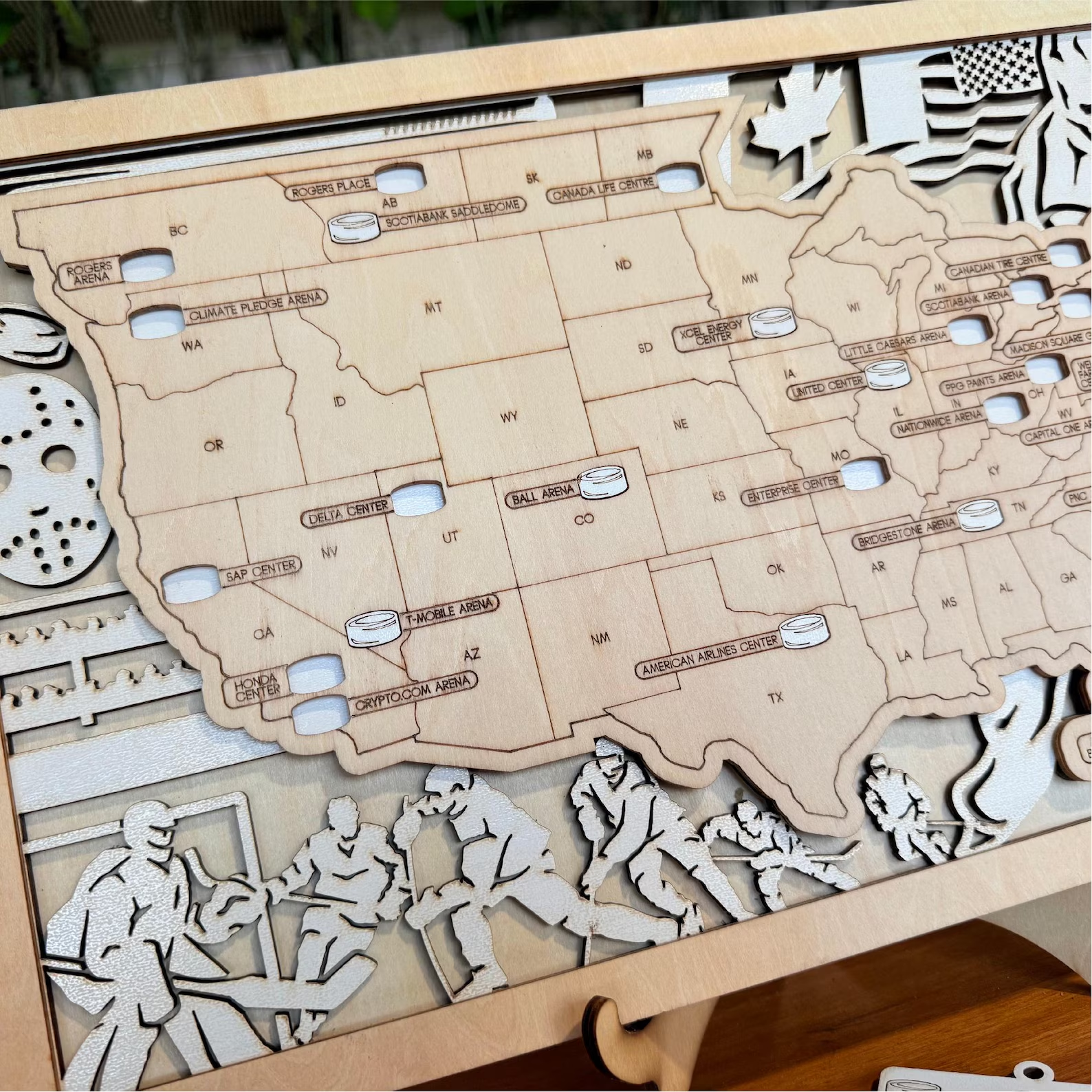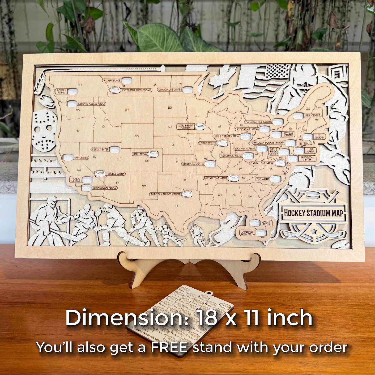 Personalized NHL Arena Travel Map with Stand - Wooden Bucket List