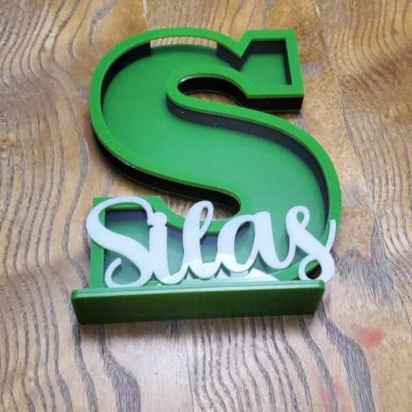 Personalized wooden piggy bank with custom letter shapes and name tags. Features a clear acrylic front so children can watch their savings grow. Perfect for teaching kids about saving money while creating a unique, keepsake gift tailored to their personality.