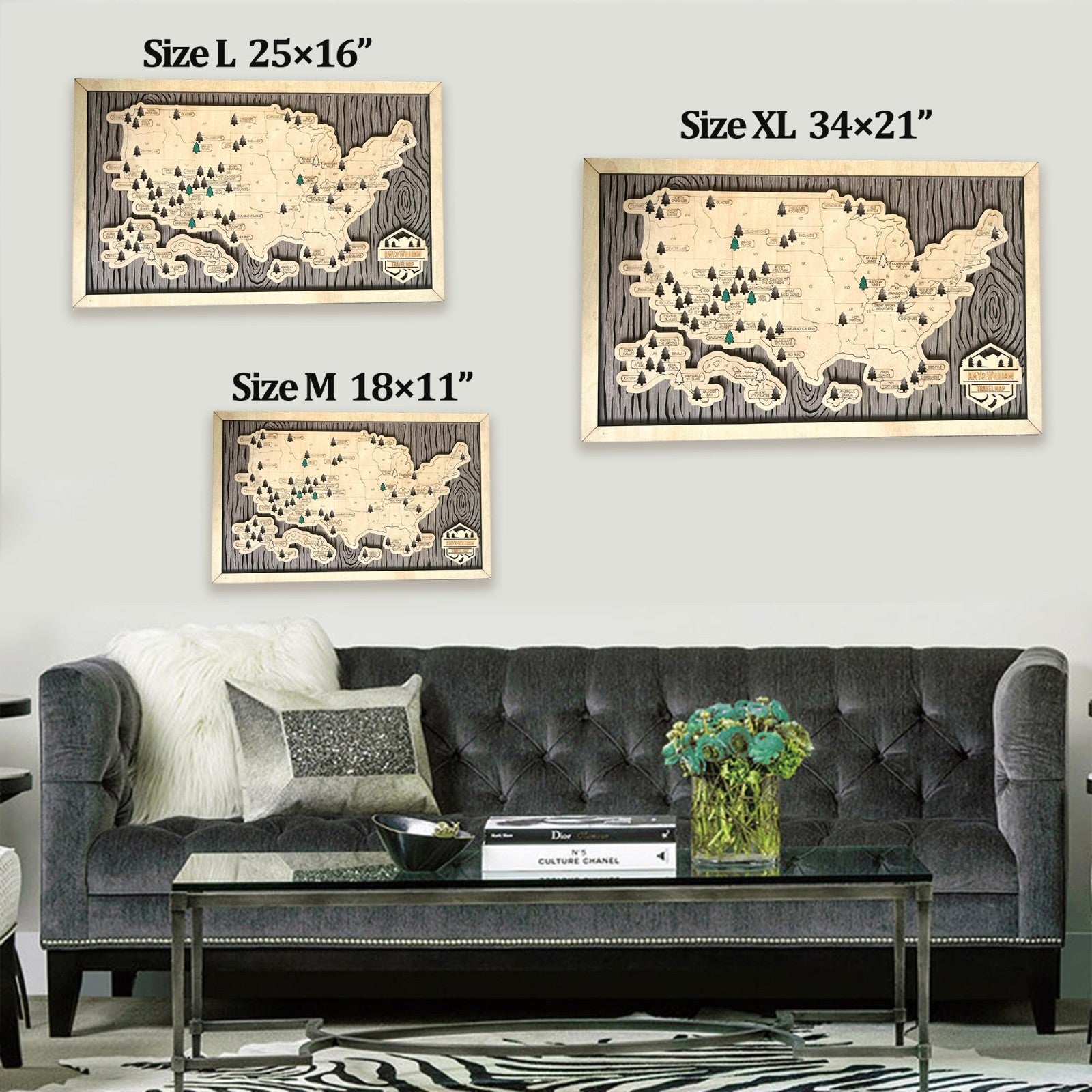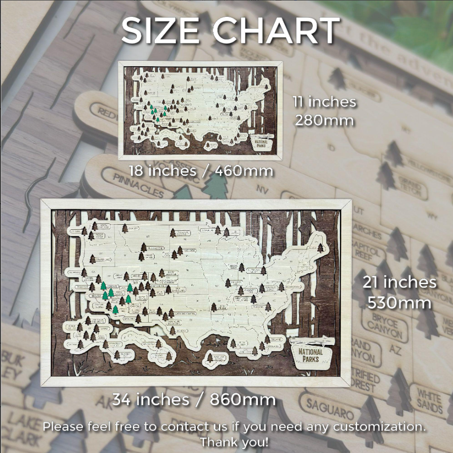 Celebrate your adventures with our meticulously handcrafted National Parks Wooden Travel Map—a timeless keepsake designed for explorers and nature enthusiasts. Crafted from premium, sustainably sourced wood, this elegant two- or three-layer display frame transforms your park visits into a visual masterpiece. Choose the three-layer design to add depth and artistry with intricate laser-cut patterns nestled between the bottom layer and the map, creating a captivating 3D effect. The detailed map highlights all U.S. national parks across the mainland, Alaska, and Hawaii, inviting you to mark each visited park with green trees icon (included). Unlike ordinary checklists, this piece doubles as rustic home decor—perfect for offices, living rooms, or cabins—while inspiring future journeys. Durable, lightweight, and easy to hang, it’s an ideal gift for hikers, retirees, or newlyweds building memories. Elevate your wanderlust with a functional heirloom that honors America’s natural wonders and your personal travel legacy! P R O D U C T ∙ D E T A I L Material: Wood Size: 18x11: 18in x 11in / 480mm x 260mm 34x21: 34in x 21in / 860mm x 530mm Package included: Frame + Hanger + Stand + Tree icons Please feel free to contact us if you need larger size. Thank you! Personalization ‼Please double-check the spelling, we will make it exactly as you have entered without making any modifications.‼ N O T E Please note that due to the nature of the engraving process, each personalized item may vary slightly in appearance. Some may appear darker or lighter than others, while others may have burn marks or wood knots. This is a natural result of the engraving process and does not indicate a defect or flaw in the product. Please understand that each item will not look exactly alike, but this uniqueness is part of the charm and character of a personalized product.