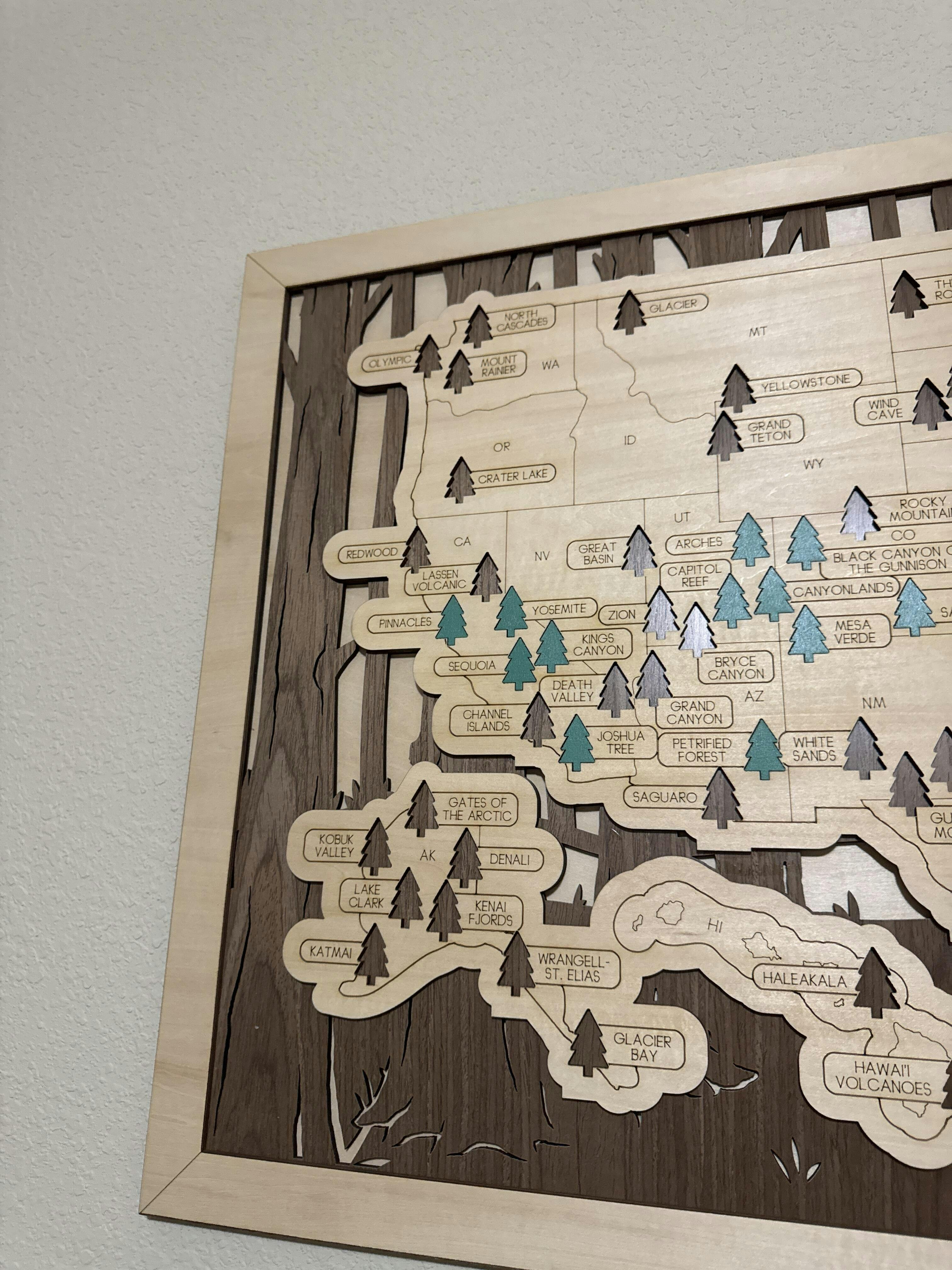 Track your national park adventures with this handcrafted wooden map. Features a detailed layout of all U.S. parks across the mainland, Alaska, and Hawaii. Choose between a two-layer or three-layer design with laser-cut patterns for added depth. Mark visited parks with included green tree icons.