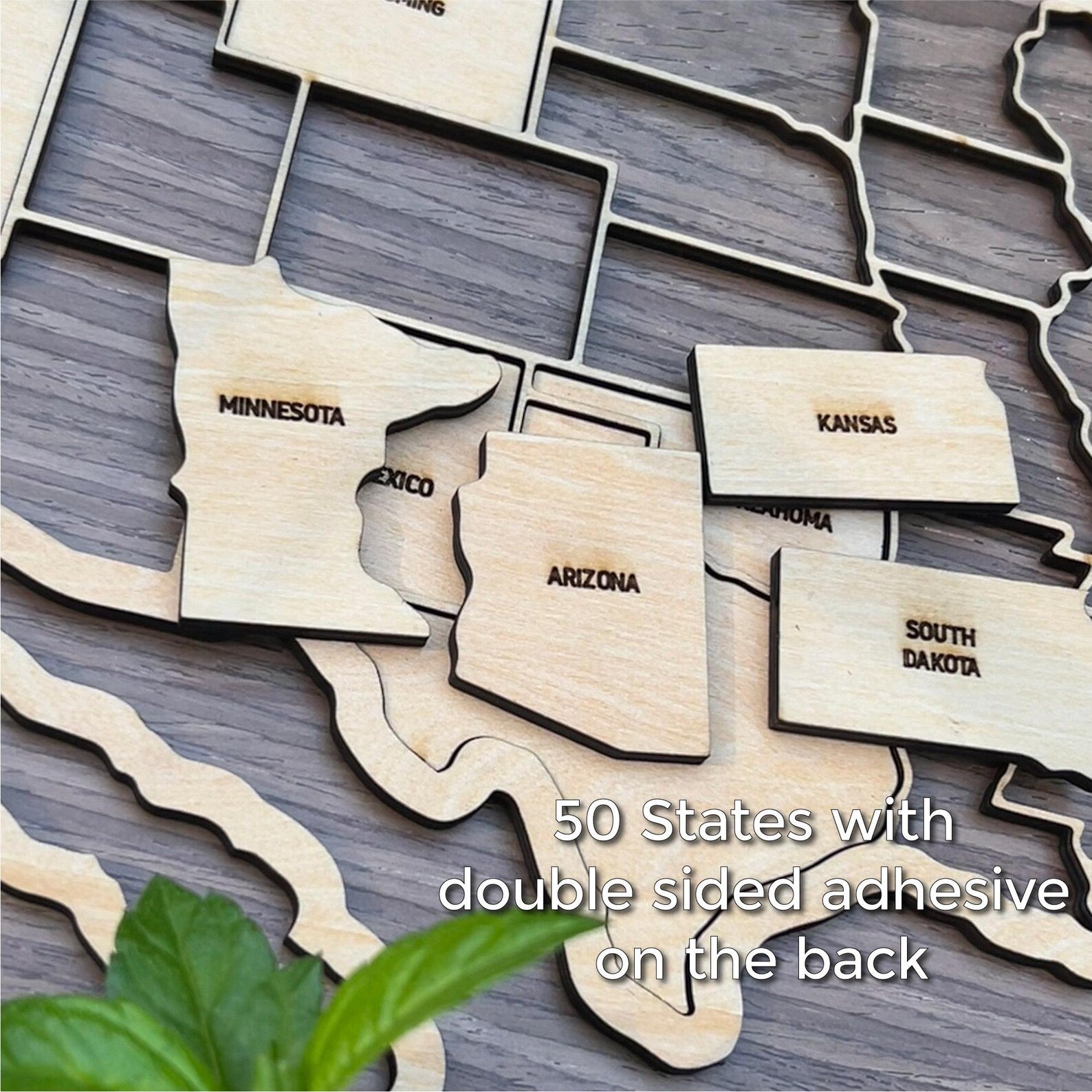 This wooden USA travel map crafted from premium basswood, transforms wanderlust into tangible memories. Choose a minimalist 2-layer design or opt for the 3-layer masterpiece with a laser-cut abstract American flag backdrop, where layered shadows add depth to your storytelling. Each of the 50 states is individually laser-cut as a removable wooden piece with dual-sided adhesive backing—simply peel and stick states you’ve visited onto the map’s surface to track adventures over time. The customizable label can engraves names,milestone dates, or quotes (“Adventure Awaits”), while precision-carved state outlines invite tactile interaction: color them, add tiny photos, or attach travel tokens. Perfect for couples documenting shared journeys, graduates mapping career moves, or families chronicling road trips, this functional art piece blends rustic charm with modern utility. Durable yet lightweight, its museum-grade sanded finish showcases laser-etched details, from state borders to hidden national park icons. Gift-ready in eco-friendly packaging, it evolves with every new destination.