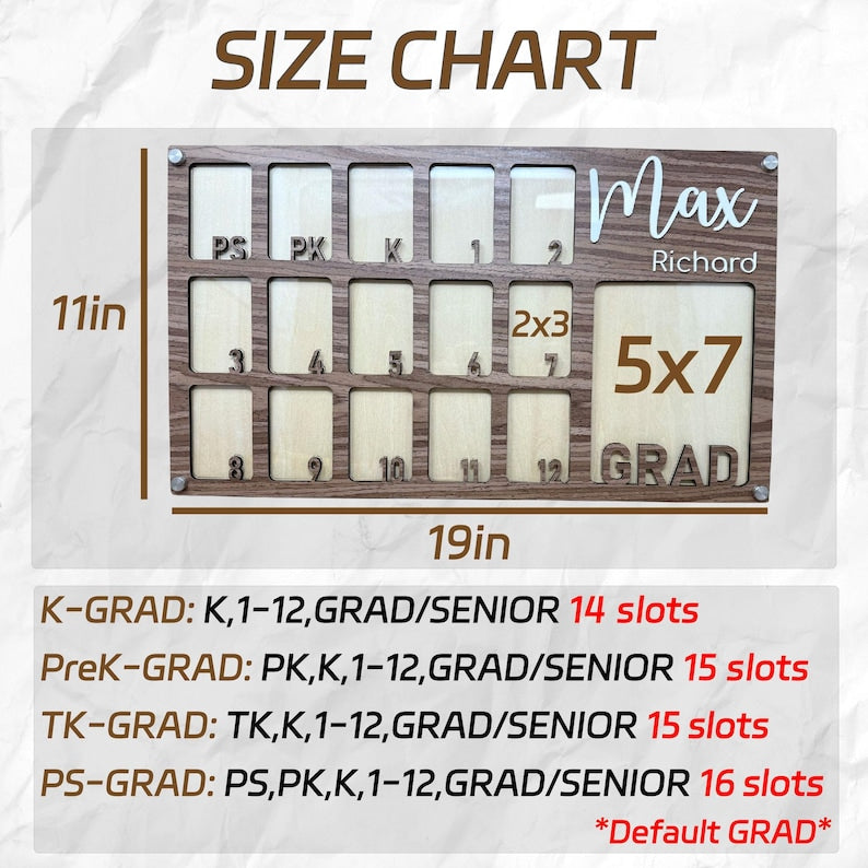 3. 1 x 5*7'' photo slot, and 13 (K to Grad) or 14 (PreK to Grad ) 2*3'' photo slots.