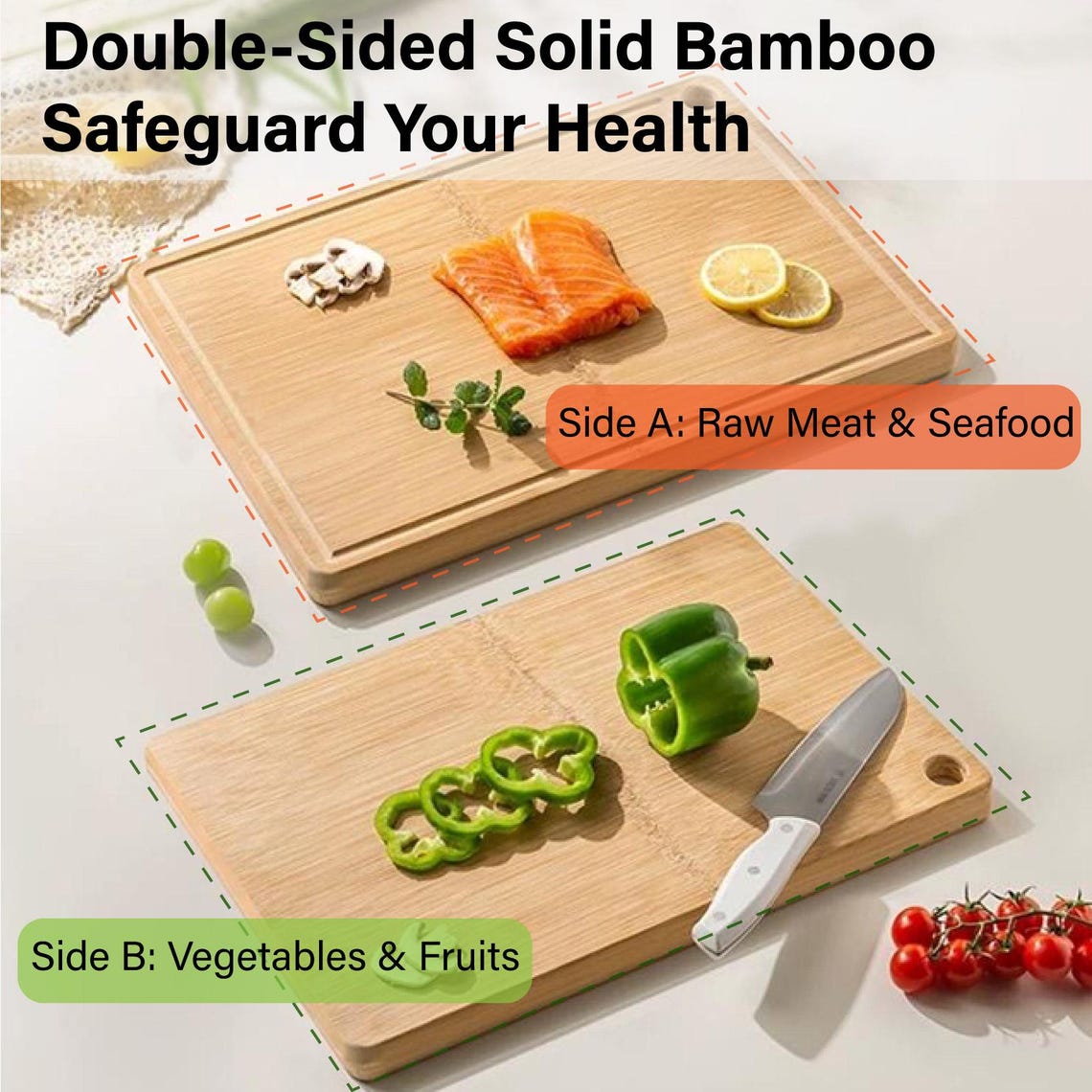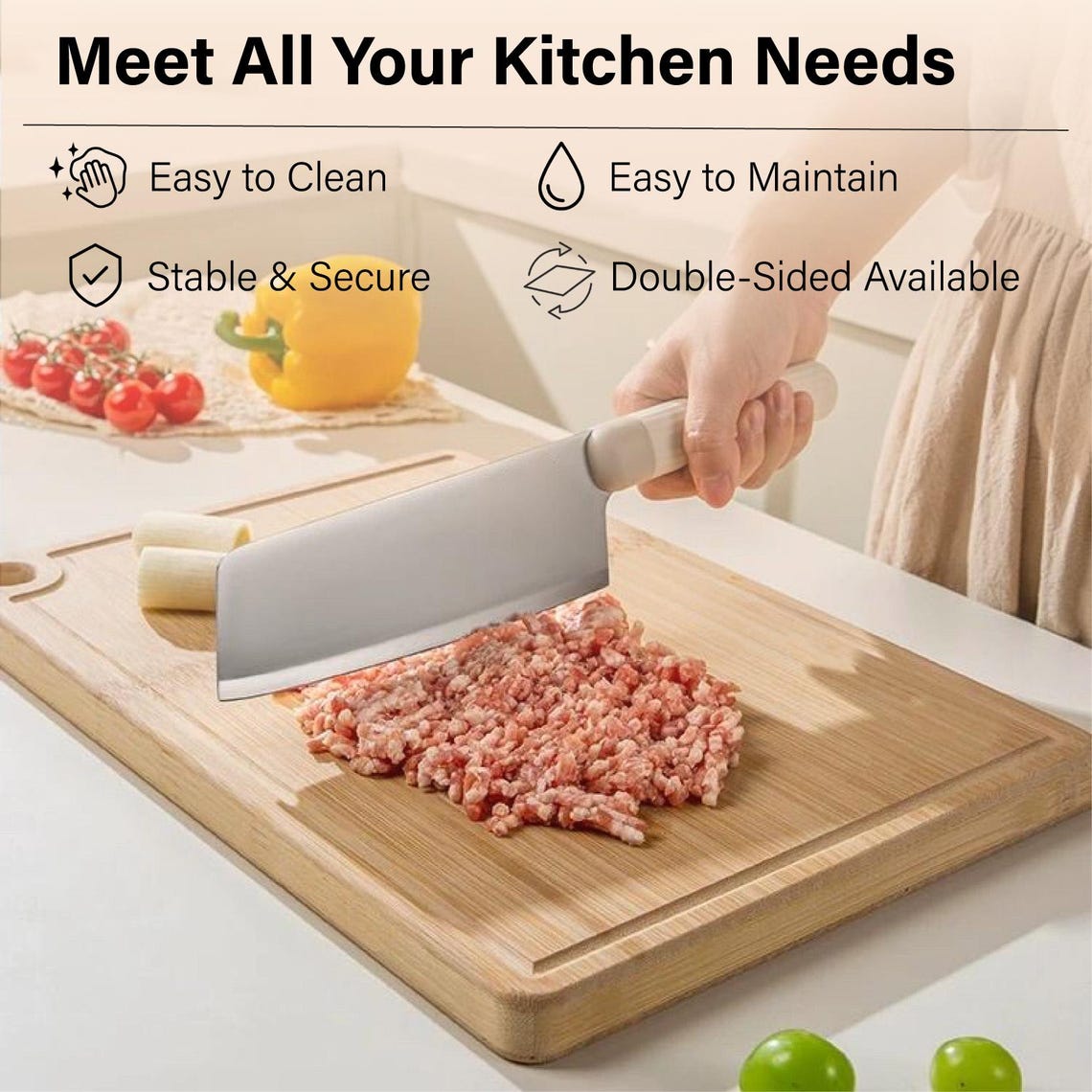 Flip it! Use one side for chopping veggies 🥕, the other for slicing meats 🥩. Bonus: The ultra-smooth edges protect hands and countertops—no splinters, just smiles! 😊